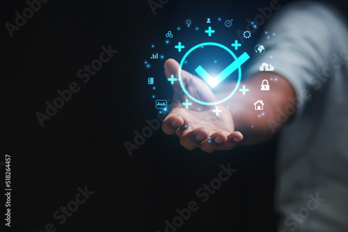 businessman working with laptop defense system Quality Assurance Symbols, Standards, ISO Certification and Technological Standards Concepts