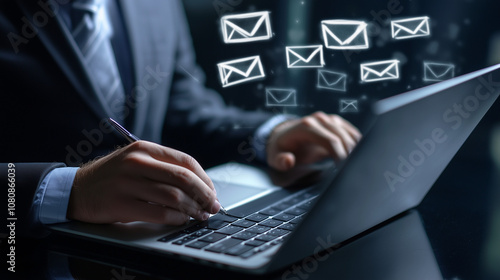 businessman writing emails on notebook laptop. close up view on hands typing. bright mail icons