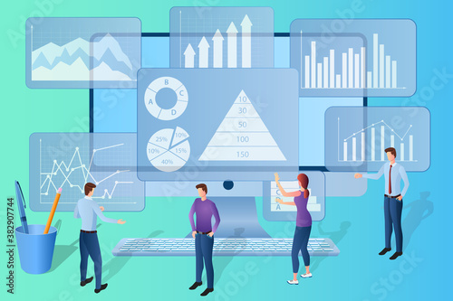 Businessmen analyze data on a personal computer.teamwork,use of modern technologies.Electronic learning webinar for students.Online video training.Isometric illustration