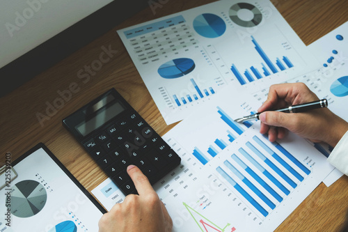 Businessmen are pointing numbers, graph, chart in business results. Business concept.