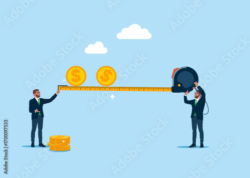 Businessmen hold measurement tape coins. Growth in investment, financial operations, investment. Accuracy and measurement. Vector illustration