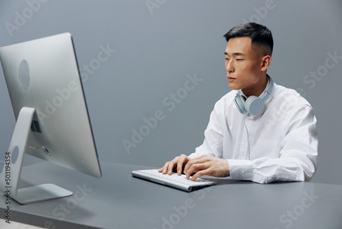 businessmen in a white shirt with headphones sits in the office Lifestyle work