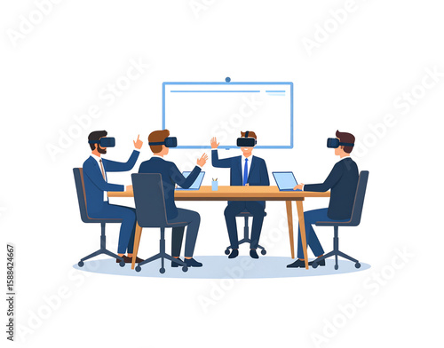 Businessmen in suits collaborating in a virtual reality meeting wearing VR headsets and gesturing.