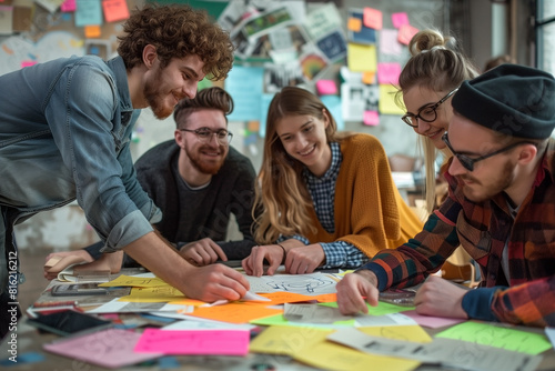 Businesspeople discussing ideas and making plans at a table in a contemporary workplace.