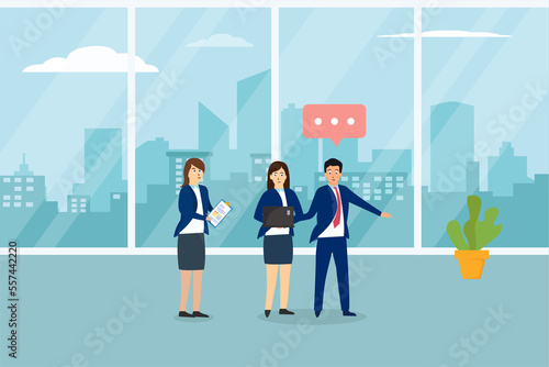 Businesspeople discussing while standing in the office, Flat design illustration