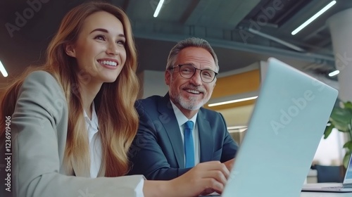 business, office, laptop, computer, working, smiling, happy, together, teamwork, collaboration, technology, businessperson, professional, colleague, meeting, discussion, project, success, achievement, career, corporate, executive, management, finance, marketing, sale, strategy, planning, analysis, communication, connection, cyberspace, online, digital, modern, workplace, desk, indoor, man, woman, adult