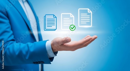 Businessperson in blue suit presenting digital document icons, one with a green checkmark, symbolizing successful approval, contract management, and efficient paperwork.