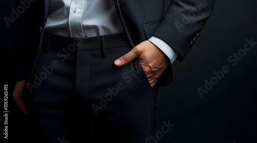 businessperson, suit, confidence, hand, pocket, formal, attire, professional, fashion, elegance, man, dark, background, stylish, corporate, businessman, casual attire, sophisticated, groomed, tailored, modern, luxury, smart, outfit, presentation, confident, male, dress, appearance, business, executive, portrait, lifestyle, image, pose