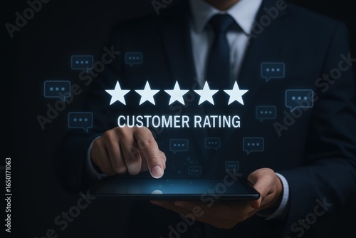 Businessperson interacting with a digital customer rating display.