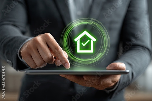 business, person, tablet, house, icon, green, checkmark, digital, interface, technology, hover, touch, hand, hovering, pointer, businessman, modern, concept, home, property, real estate, investment, security, safety, protection, management, control, innovation, future, progress, online, virtual, display, interactive, application, solution, efficient, approved, solution, automation, connectivity, transformation, modernization