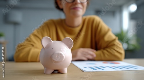 Businesswoman calculating home budget and analyzing financial statistics using piggy bank, planning investments for buying or renting property and paying mortgage