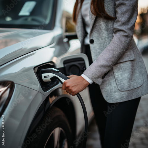 Businesswoman charging EV. Charging an electric car. EV - electric vehicle concept