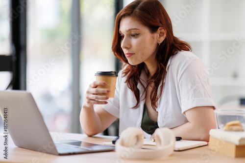 Businesswoman drinking coffee at table in office. Break time