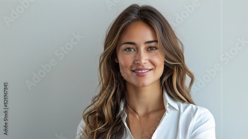 businesswoman exuding elegance and poise, her confident smile shining against the simplicity of a white background