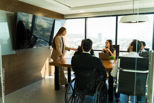 Businesswoman giving a sales pitch in a meeting room with diverse people and clients