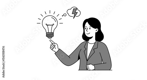 idea, creativity, innovation, businesswoman, office, thinking, light bulb, concept, professional, illustration, thought, cloud, woman, design, solution, strategy, inspiration, lightning, monochrome, graphic, cartoon, creative, brainstorming, planning, insight, imagination, corporate, intellect, clever, leadership, abstract