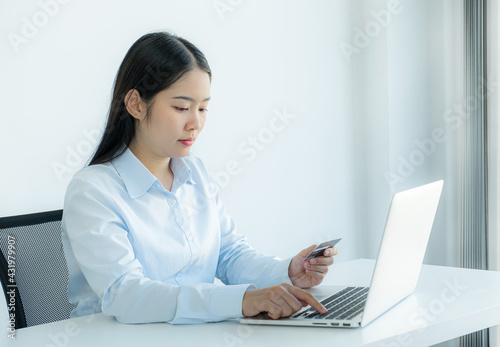 Businesswoman holding and use credit card to online shopping from home with laptop, payment e-commerce, internet banking, spending money for next holidays