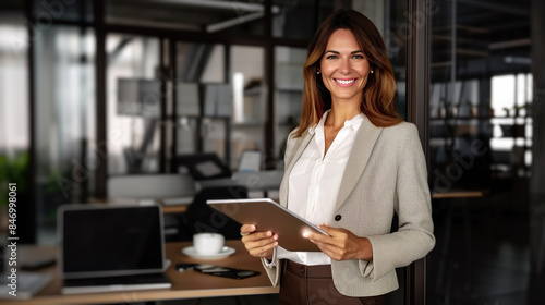 businesswoman, tablet, office, modern, professional, smiling, technology, success, corporate, workplace, confident, female, executive, indoor, work, business, career, leadership, person, employee