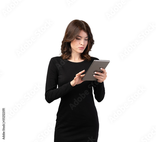 businesswoman, using, tablet, computer, technology, white, background, beautiful, business, modern, isolated, attractive, woman, portable, professional, executive, person, screen, digital, work, communication, touch, holding, beauty, career, girl, portrait, pretty, young, cyberspace, confident, space, display, information, leadership, glamour, gorgeous, fashionable, job, chatting, online, smart, happy, people, black, caucasian, brunette, serious, dress
