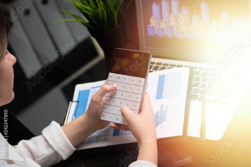 Businesswoman investment consultant analyzing company annual financial report balance sheet statement working with calculator and laptop