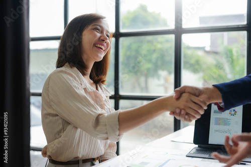 business, woman, office, handshake, meeting, success, agreements, partnership, deal, teamwork, professional, corporate, finance, businessperson, executive, manager, client, shaking, hand, happy, smiling, cheerful, confident, laptop, document, chart, graph, window, natural, light, modern, interior, startup, entrepreneur, collaboration, negotiation, investment, growth, strategy, marketing, sale, client, service, asian, diversity, inclusion, 2, asia
