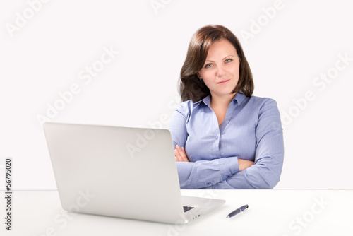 businesswoman, laptop, business, woman, assurance, folded, computer, modern, arm, crossed, sitting, ball pen, contemporary, monitor, smiling, success, office, notebook, beautiful, young, looking, technology, crossing, positivity, working, confidence, aluminium, professional, sureness, open, desk, silver, manager, front, reliance, secretary, communication, global, cyberspace, concept, idea, table, shirt, retina, white background