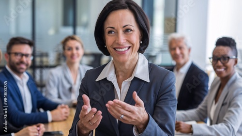 Businesswoman Leading a Meeting. A confident businesswoman addresses a group of colleagues in a well-lit office setting, conveying a sense of professionalism and leadership.