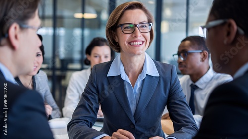 Businesswoman Leading a Meeting. A confident businesswoman addresses a group of colleagues in a well-lit office setting, conveying a sense of professionalism and leadership.