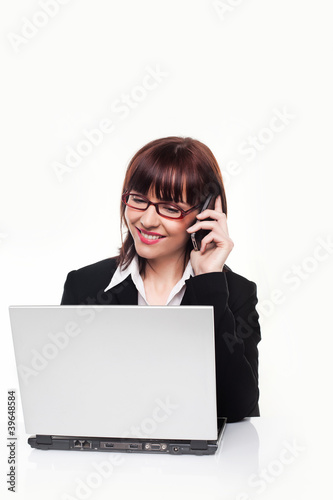 attractive, female, girl, isolated, people, smile, smiling, white, woman, business, information, brunette, alone, beautiful, happy, businessman, friendly, adult, communication, pretty, mobile phone, phone, health, hand, businesswoman, talking, mobile, conversation, good, connection, speaking, listening, laptop, teenage, active, senior, meeting, redhead, on white, talk