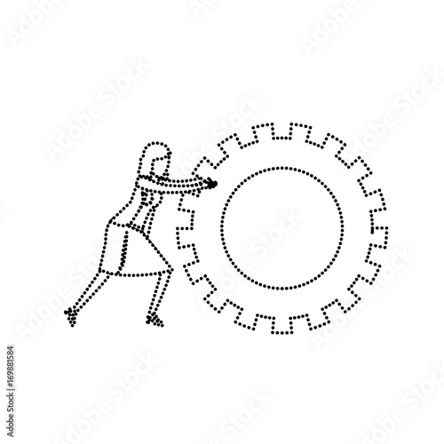 businesswoman pushing a big gears cogwheel monochrome silhouette dotted