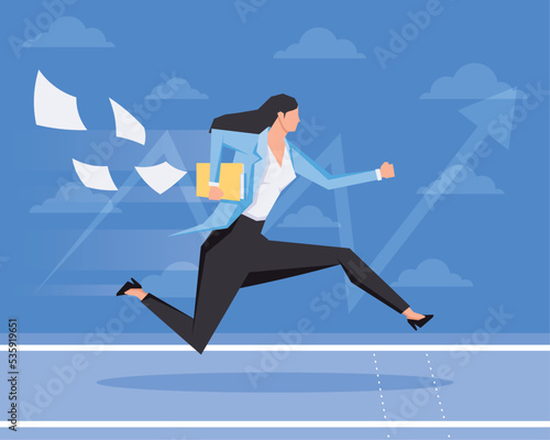 businesswoman, running, finance, work, paper, scene, folder, file, document, woman, female, runner, success, character, leadership, person, speed, corporate, leader, economic, motivation, vector, design, illustration