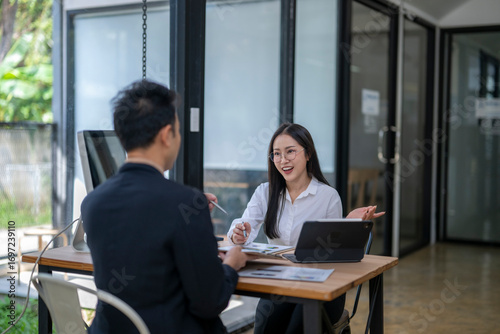 business, meeting, office, discussion, collaboration, teamwork, businesswoman, businessman, colleague, communication, explaining, project, strategy, planning, analysis, marketing, sale, finance, investment, datum, chart, graph, technology, digital, tablet, computer, modern, workspace, professional, corporate, executive, partnership, growth, success, innovation, idea, sharing, brainstorming, problem, solving, consulting, advice, mentor, learning, training, development, career, achievement
