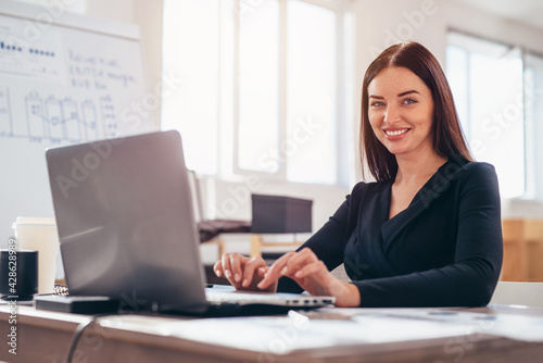 Businesswoman sits with her laptop at her workplace