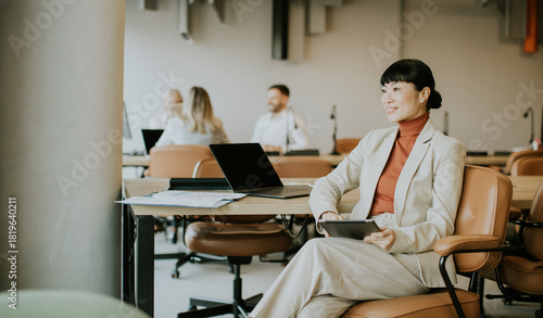 businesswoman, office, tablet, colleague, working environment, thoughtful, contemporary, workspace, furniture, design, productivity, career, meeting, teamwork, corporate, sharpened, success, interior design, sitting, technology, communication, innovation, strategy, organisation, planning, multitask, motivation, leadership, collaboration, networking, brainstorming, executive, attire, confident, relaxed, engaging, interaction, atmosphere