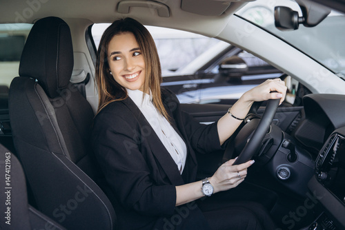 woman, car, driving, business, businesswoman, vehicle, dealership, automobile, transport, transportation, new, auto, steering, wheel, smile, happy, showroom, purchase, client, buying, interior, inside, test, drive, sale, automotive, elegant, suit, sitting, holding, looking, successful, professional, confident, modern, luxury, comfortable, choosing, salesgirl, attaching