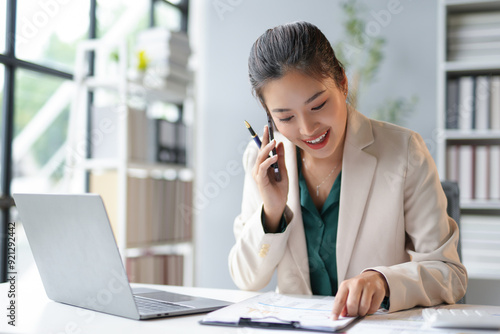 business, woman, office, phone, talking, smiling, working, laptop, computer, desk, document, paperwork, businesswoman, professional, career, communication, technology, connection, cheerful, happy, success, confident, corporate, executive, manager, entrepreneur, finance, accounting, analysing, datum, strategy, planning, modern, workplace, indoor, 1, person, adult, young, asian, ethnicity, white, collar, day, looking, down, sitting, asia