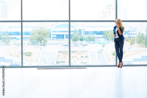 Businesswoman standing against office window talking on mobile phone