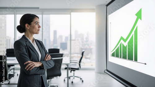 businesswoman, professional, office, meeting, room, presentation, growth, chart, graph, upward, arrow, success, finance, strategy, corporate, career, management, executive, city, view, window, datum, analysis, performance, achievement, planning, woman, suit, arm, crossed, confident, modern, interior, projector, screen, statistic, profit, revenue, improvement, progress