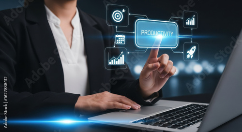 Businesswoman touching productivity icon on virtual screen, surrounded by digital business analytics, growth, and planning symbols, working on laptop in modern office environment
