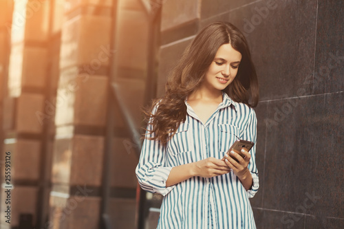 Businesswoman uses a mobile phone, walking along the city streets with coffee in her hand.