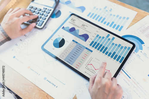 Businesswoman using a tablet to analysis graph company finance strategy statistics success concept and planning for future in office room.