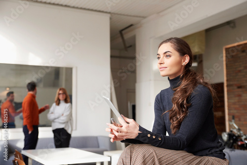 business, businesswoman, touchpad, computer, thinking, thought, contemplation, woman, woman, young, working, work, men at work, secretary, office, sitting, desk, assistant, administrator, people, person, attractive, financial, adviser, sale, clerk, 20s, 30s, professional occupation, manager, technology, communication, caucasian, confident, smiling, beautiful