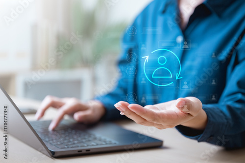 Businesswoman using laptop with hologram of user icon and circular arrows, concept of CRM, customer relationship management, user retention, customer experience, and digital marketing.