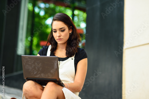 laptop, woman, computer, young, outdoors, person, beautiful, female, technology, business, girl, outside, working, adult, notebook, typing, businesswoman, student, cyberspace, lifestyle, urban, city, street, pretty, attractive, caucasian, white, cute, background, casual clothes, brown hair, 20s, 20s, communication, device, casual attire, sitting, wireless, modern, day, freelance