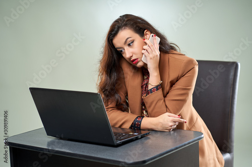 business, woman, speaking, mobile, phone, girl, laptop, attractive, to sit, desk, businesswoman, latino, hispanic, latin, mobile phone, computer, corporate, employee, executive, female, formal, cyberspace, isolated, job, lifestyle, looking, manager, modern, people, person, portrait, pretty, professional, smile, studio, success, successful, technology, wireless, work, young