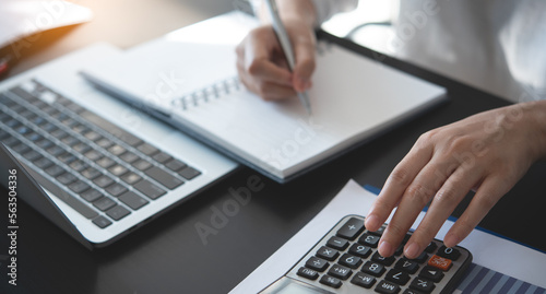 Businesswoman working at office, using calculator to calculate financial report, sales data, with laptop computer and business document on office table, close up. Business, finance and investment