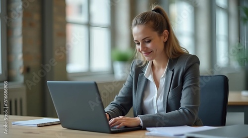 business, woman, laptop, computer, businesswoman, office, working, desk, work, people, person, cyberspace, smiling, technology, job, men at work, professional, success, sitting, corporate, executive, notebook, manager, smile, workplace