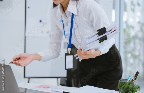 businesswoman, paperwork, office work, white shirt, corporate, woman, working, employee, job, career, occupation, professional, task, assignment, tied-up, workload, file, report, datum, information, analysis, organisation, planning, strategy, desk, laptop, indoor, workplace, bright, light, clean, tidy, lanyard, identification, id card, pen, plant, document, business, finance, management