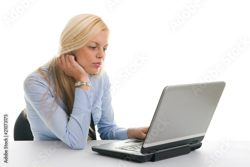 learning, reading, woman, student, computer, laptop, business, watch, education, businessperson, shirt, copy space, one person, attaching, cyberspace, tied-up, businesswoman, smart, isolated on white, sitting, long hair, female, portrait, adult, 20s, blond