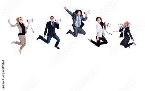 jump, megaphone, dynamic, jump, motivation, group, attractive, background, elegant, emotion, face, female, manager, model, person, portrait, positive, professional, suit, commercial, motivated, cheer, release, blank, room, isolated